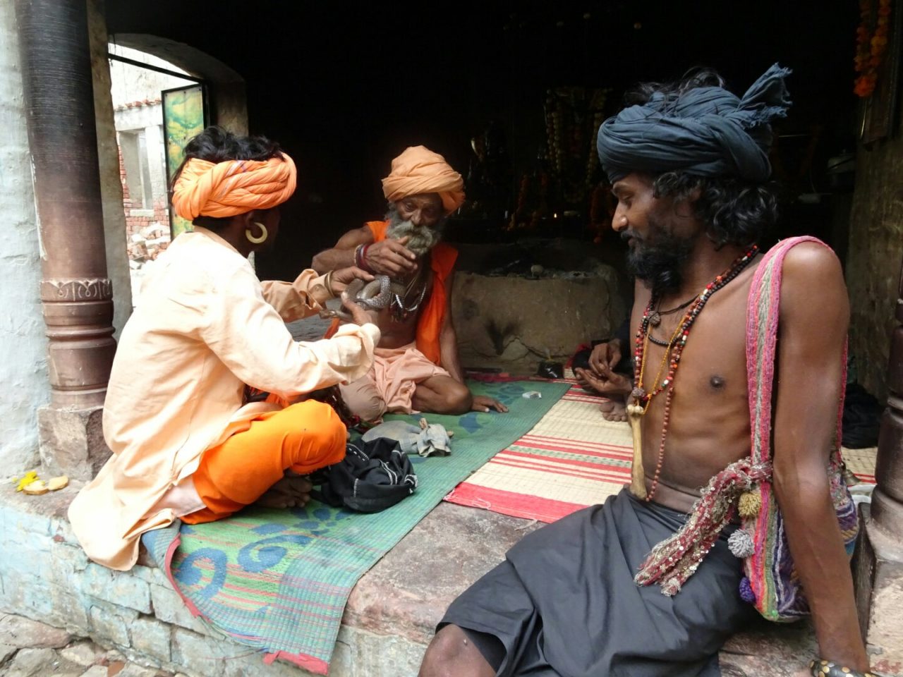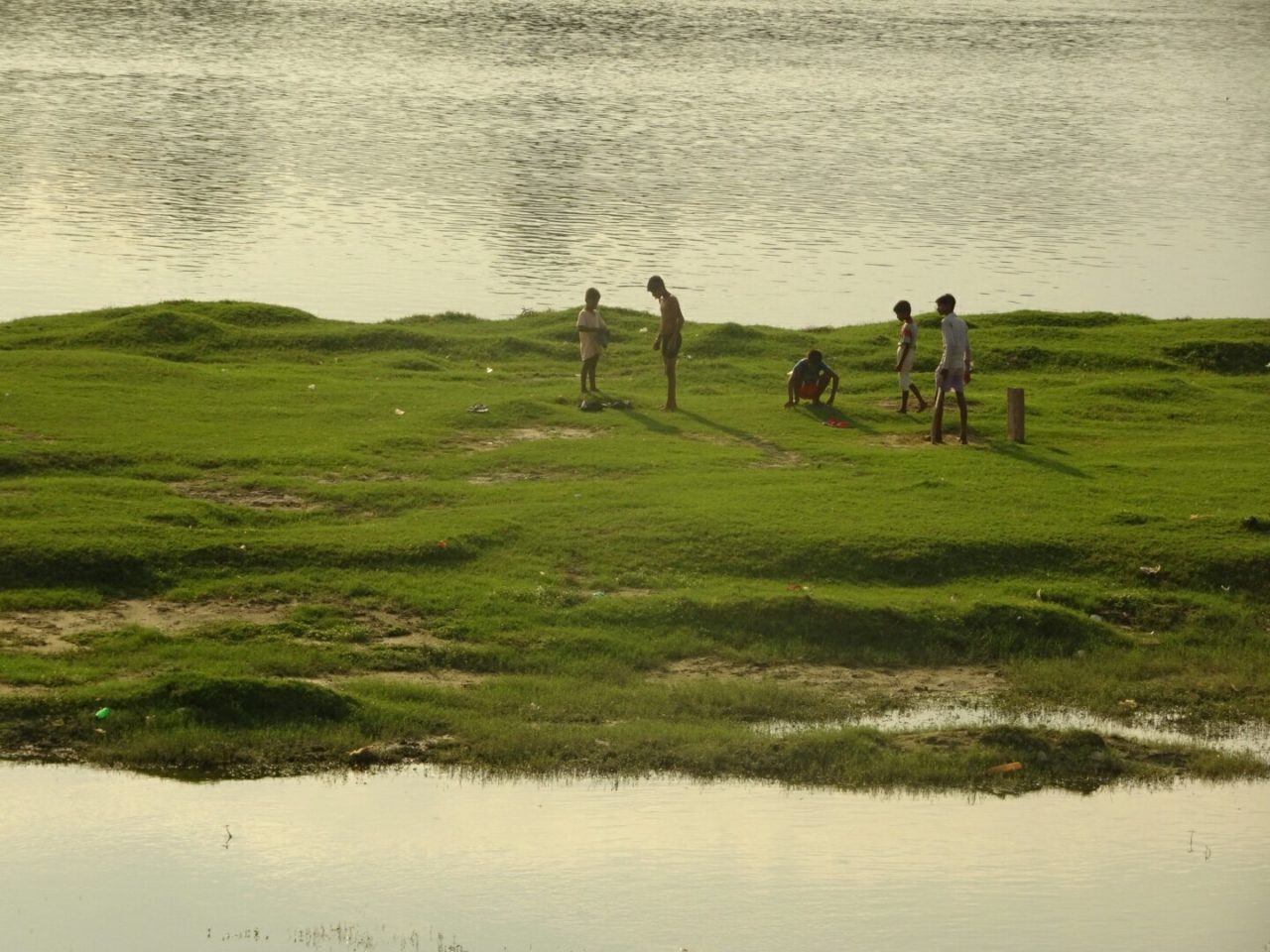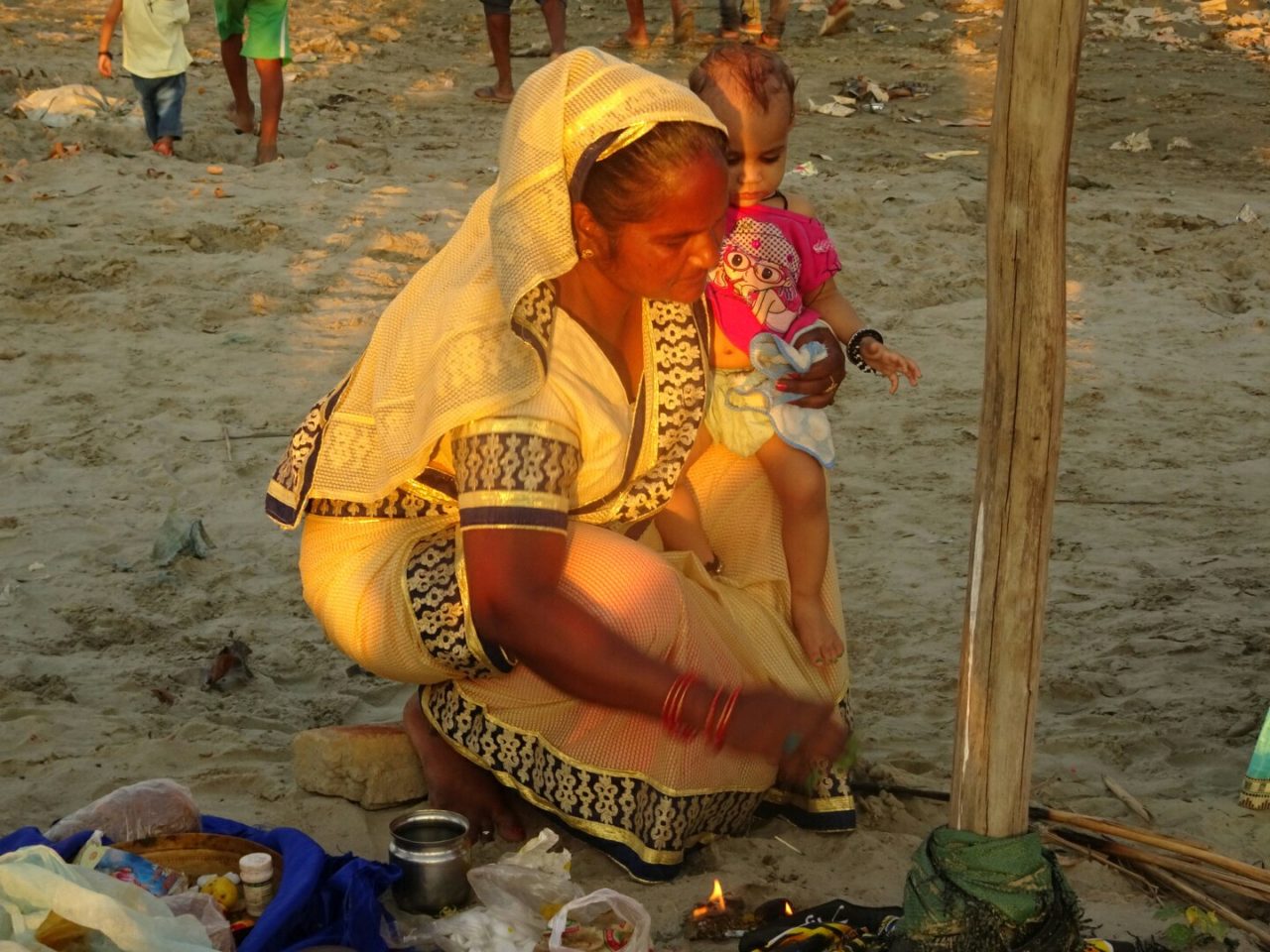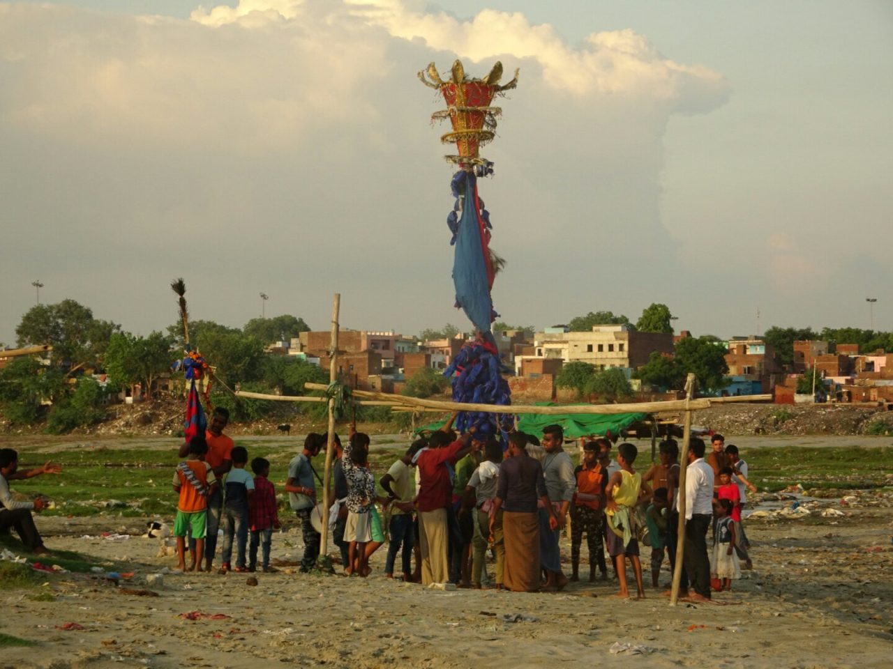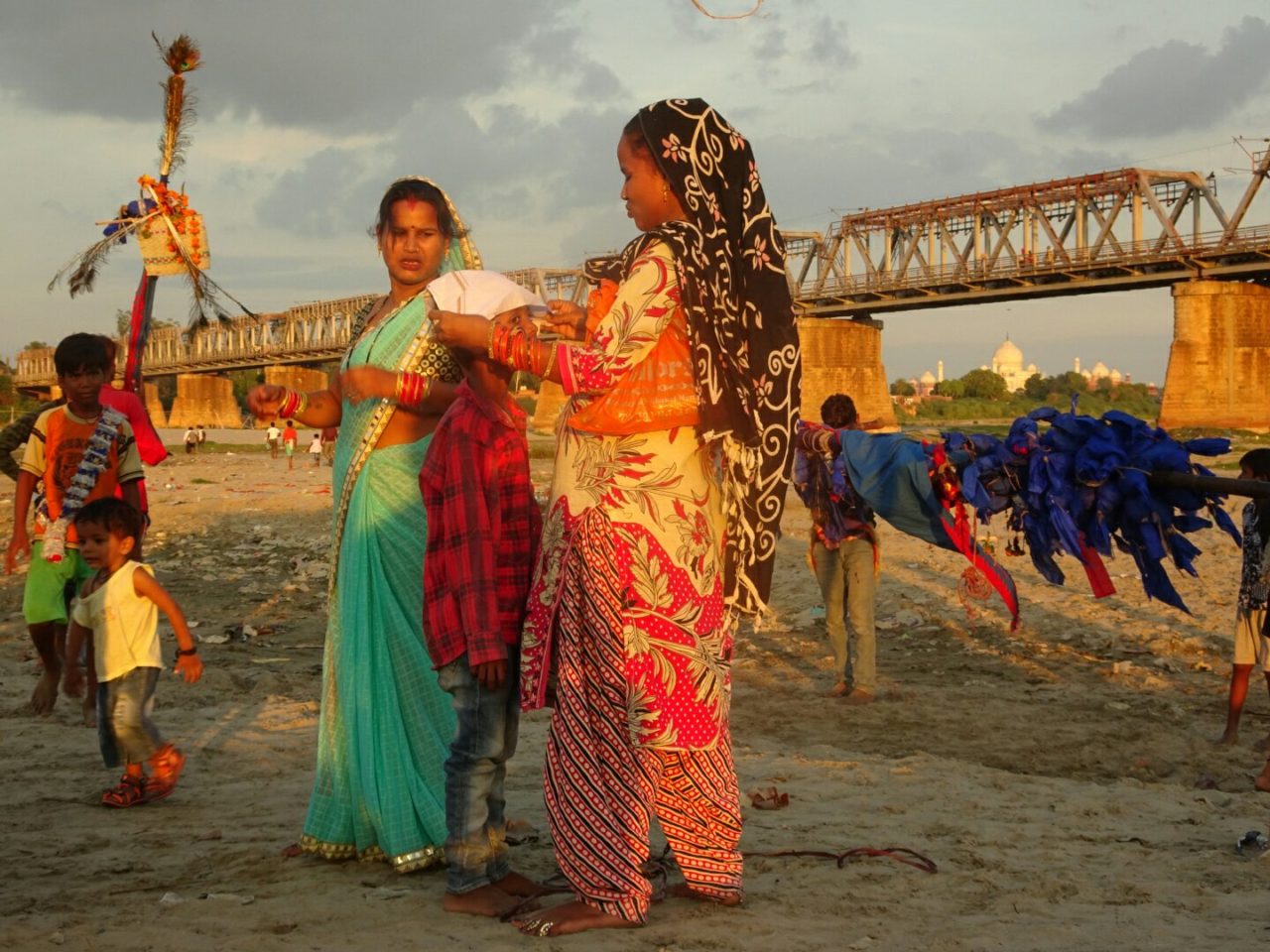 En descendant vers la rivière, ou le dépotoir, je ne sais pas trop, une puja (prière hindoue) est l’occasion de belles rencontres. Un lourd totem est brandi par un seul homme au son des tambours tandis que l’on prépare les petits bateaux-bougies-prière que la rivière emporte doucement.