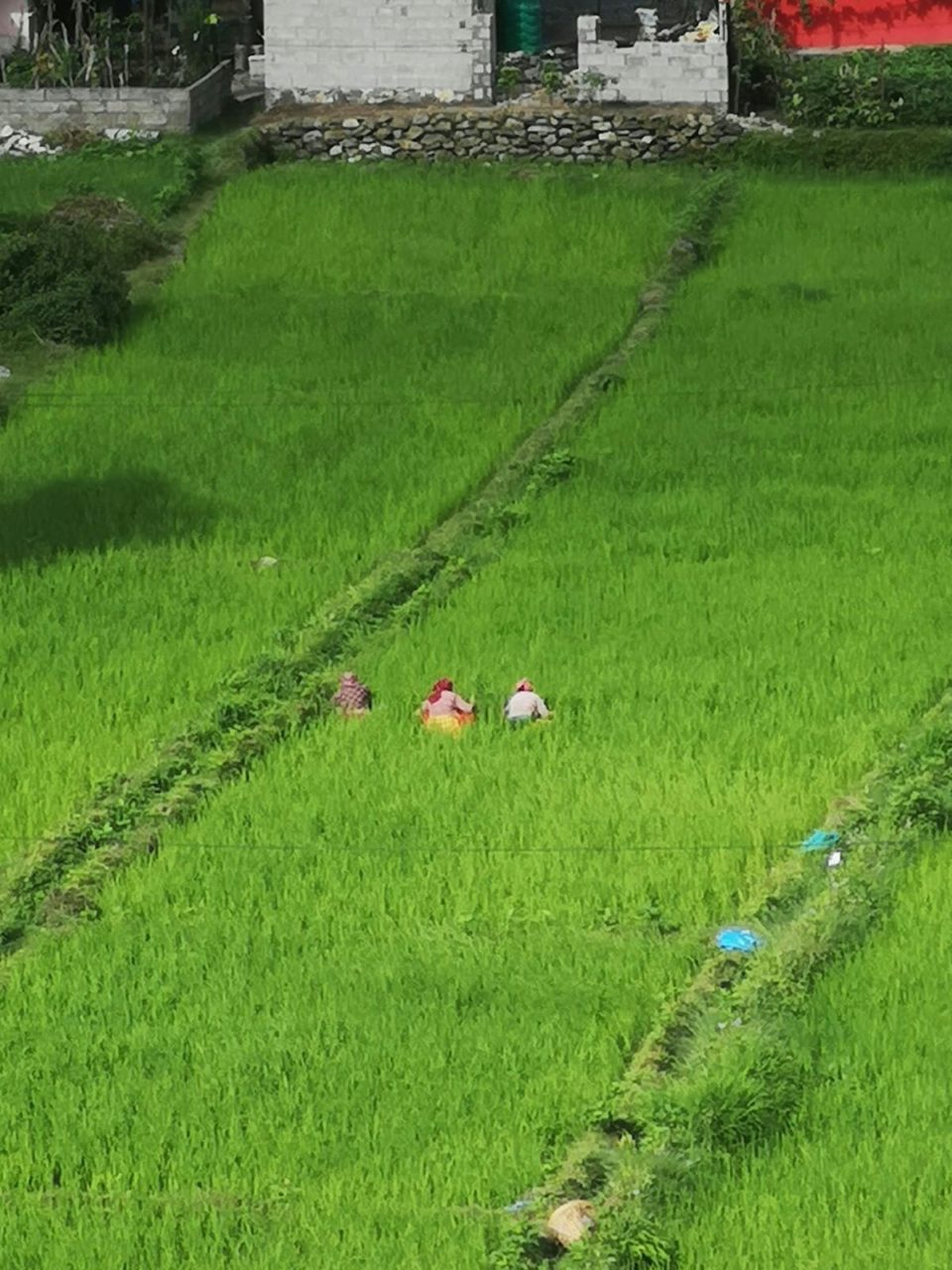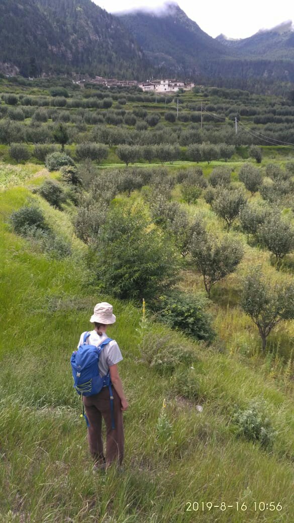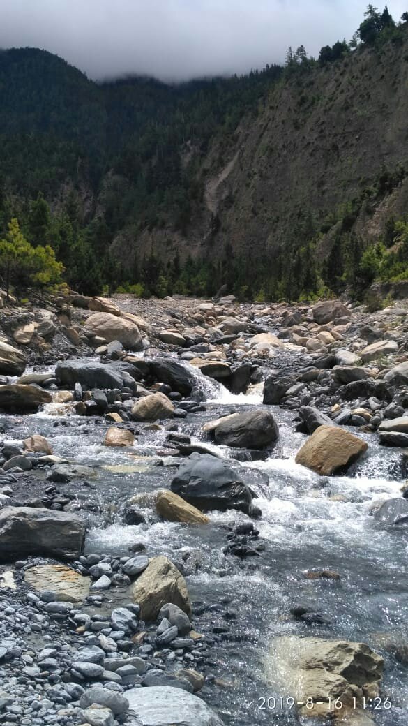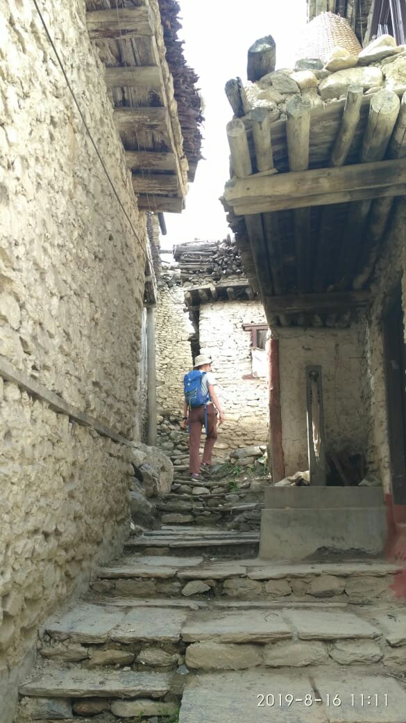 Rojan m’avait proposé d’aller voir un lac à 2 heures de marche de Jomsom pour profiter une dernière fois des paysages fabuleux. Finalement, après 1h30 de marche sur la piste, nous bifurquons vers les petits sentiers montagneux. Certains d’avoir définitivement perdu notre chemin, nous cherchons tout de même à continuer notre ascension vers le sommet de la montagne pour tomber sur des petits chortens construits par les villageois du village voisin. Nous sommes au milieu de nulle part et tentons de redescendre comme nous pouvons. Un petit village aperçu au loin nous invite à le rejoindre et nous nous y engageons non sans mal car il nous faut escalader les murs protecteurs de l’un des plus beaux vergers que je n’ai vu durant notre voyage. À nous les magnifiques pommiers aux fruits mûrs à point ! Nous découvrons également d’autres cultures telles des plants de cannabis, cultures pourtant non légales au Népal. Arrivés au sommet du village, nous apercevons une magnifique rivière à l’eau claire en contrebas. Nous déciderons d’improviser un pique-nique où l’odeur des sapins rappelle la France et ses plaisirs à mes bons souvenirs…
